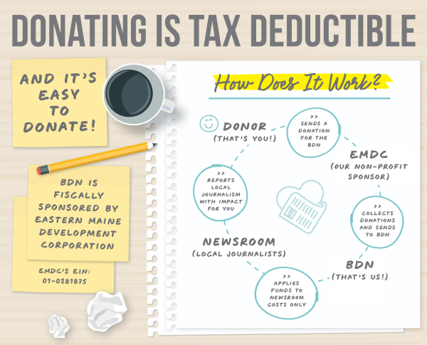 All contributions from BDN readers go into the Fund for BDN Reporting, administered by Eastern Maine Development Corporation (EIN 01-0281875). The Fund helps to cover the costs of reporting, such as journalist salaries, document request fees, and mileage to report stories.